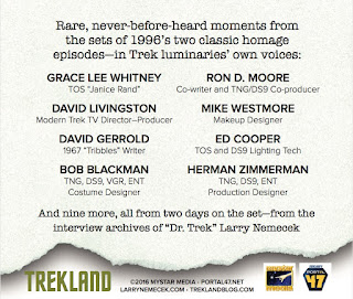 What’s more, this year’s Trekland: On Speaker Vol. 5 “30 at 50” featured my remastered stage visit to “Tribble-ations” (as well as “Flashback”), and there’s even more good background there—in 17 of the actual voices, from 1996. It’s a great anniversary year gift! The new online order page is coming with the new site in a matter of days, but for now…