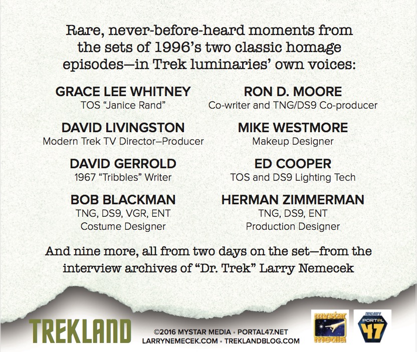 What’s more, this year’s Trekland: On Speaker Vol. 5 “30 at 50” featured my remastered stage visit to “Tribble-ations” (as well as “Flashback”), and there’s even more good background there—in 17 of the actual voices, from 1996. It’s a great anniversary year gift! The new online order page is coming with the new site in a matter of days, but for now…